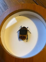 A real insect in a wooden shadow box frame. his beetle has lived with a breeder from France and shows some tokens of life because it was allowed to finish its full life cycle.